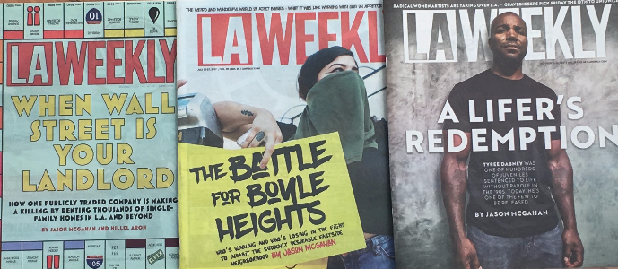 Jason McGahan is a former staff writer for the LA Weekly. McGahan's coverage of LAPD and LA County Sheriff's Department was awarded a pair of 2017 Los Angeles Press Club Awards in the categories of investigative reporting and breaking news. The Chicago Society of Professional Journalists awarded him a 2014 Peter Lisagor Award for in-depth reporting for a Chicago Magazine piece on a Mexican drug cartel's operation in that city. In 2017 and 2016, he was a finalist in the Association of Alternative Newsmedia Awards for the categories of beat reporting and feature writing, respectively. He previously reported from Mexico and Central America as a correspondent for The Daily Beast.